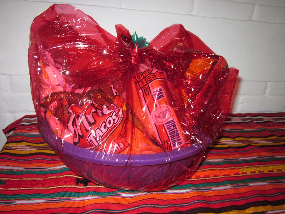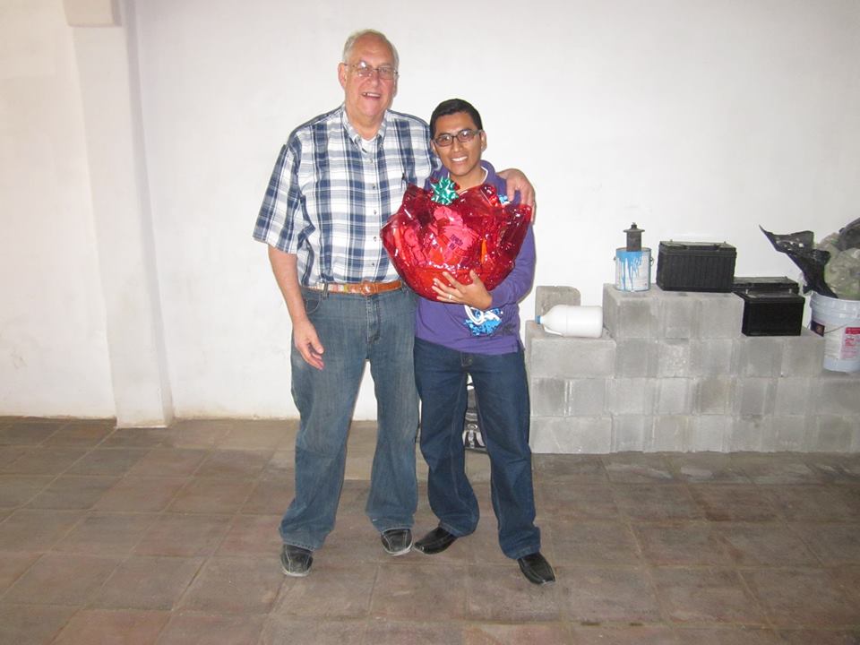 The contents are simple and basic yet people love them. The one at the right has a bag of chips, a half loaf of sandwich bread, a bag of marshmallows, a package of cookies, a half-liter of pineapple soft drink, and a baggie of grapes. These were ordered and delivered to Casa Colonial on Christmas Eve day. The hotel manager, Dagoberto, called everyone in to receive their baskets and then he took pictures. He had them pose with Bruce first handing the gift to each employee and then with Bruce having his arm around them holding the basket.