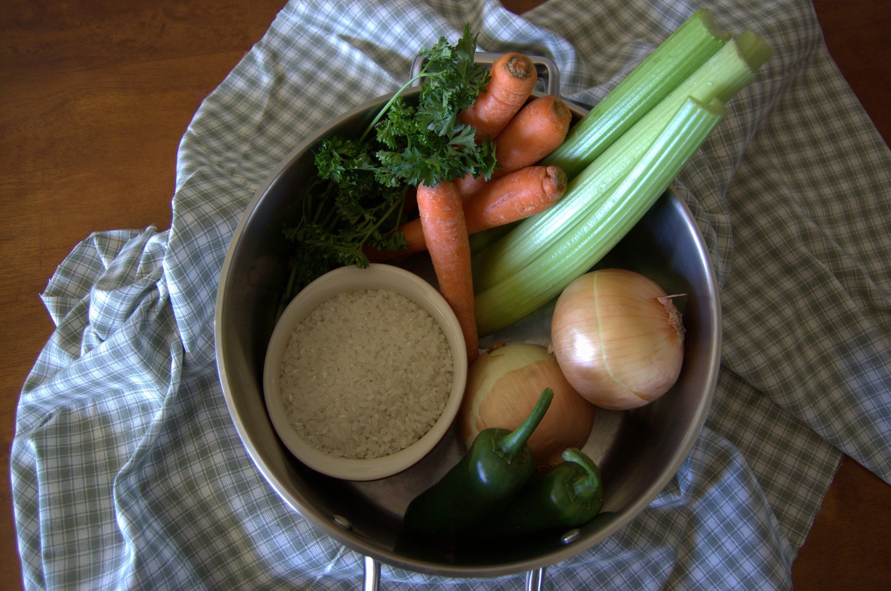 Take meat off bones and save; dispose of garlic cloves and celery leaves. Chop remaining vegetables and add to stock. With a spoon, break up the softened jalapeno peppers. Bring soup to a boil and simmer until carrots are tender, about an hour. Add uncooked rice and simmer another thirty minutes. Add chicken and heat through.
